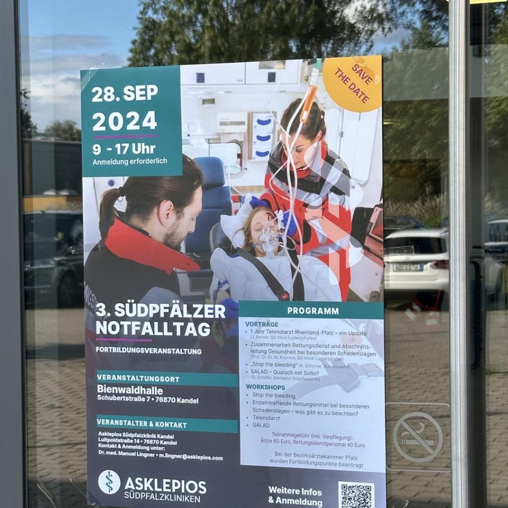 Heute fand in der Bienenwaldhalle Kandel der dritte Südpfälzer Notfalltag statt, organisiert von der Asklepios Südpfalzklinik. Auf dem abwechslungsreichen Programm standen spannende Vorträge wie „Ein Jahr Telefonarzt Rheinland-Pfalz“ und Zusammenarbeit Rettungsdienst Abschnittsleitung Gesundheit bei besonderen Schadenslagen“ sowie Workshops wie Stoppt die Blutung“ und Ersteintreffende Rettungsmittel bei besonderen Schadenslagen“.
